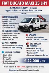 Gru FASSI F26, , Radio, 7 posti FIAT DUCATO MAXI 35 LH1 2.3 Multijet 130CV – Euro 6 Doppia cabina – Cassone fisso con gruil Prezzo visto, che mezzo commerciale, si intende n.e.t.t.o quindi da aggiungere i.v.a Disponibile Fiat Ducato Maxi 35 LH1 doppia cabina, allestito con cassone fisso e gru idraulica, veicolo robusto e funzionale, ideale per edilizia, impiantistica, manutenzioni, serramenti e lavori di cantiere. Il mezzo si presenta in buone condizioni generali, con normali segni d’uso coerenti con la categoria, struttura sana e allestimento efficiente. La doppia cabina consente il trasporto di più operatori in sicurezza e comfort, rendendolo una soluzione pratica per il lavoro quotidiano. Motorizzato con affidabile 2.3 Multijet da 130 CV, abbinato a cambio manuale a 6 marce, adatto a utilizzo professionale anche a pieno carico. Dimensioni veicolo: lunghezza circa 5.900 mm, larghezza 2.050 mm, altezza circa 2.300 mm, passo 3.450 mm. Cassone fisso con sponde in alluminio e griglia di protezione cabina. Dimensioni cassone indicative: lunghezza circa 3.000 mm, larghezza circa 2.000 mm. Massa complessiva 3.500 kg. Portata utile circa 900–1.000 kg, in funzione dell’allestimento con cassone e gru installata. Il veicolo è equipaggiato con gru idraulica FASSI F26, modello affidabile e collaudato per autocarri da 35 q.li, con le seguenti caratteristiche: momento di sollevamento 2,6 tm, portata massima fino a 990 kg, sbraccio massimo circa 5,3 metri, rotazione 370°, braccio articolato con gancio e comandi manuali. Ideale per carico e scarico di materiali edili, bancali, serramenti e attrezzature da cantiere. Veicolo proposto da Auto Saveri, esperienza e serietà dal 1969. Contattaci per informazioni o appuntamento.